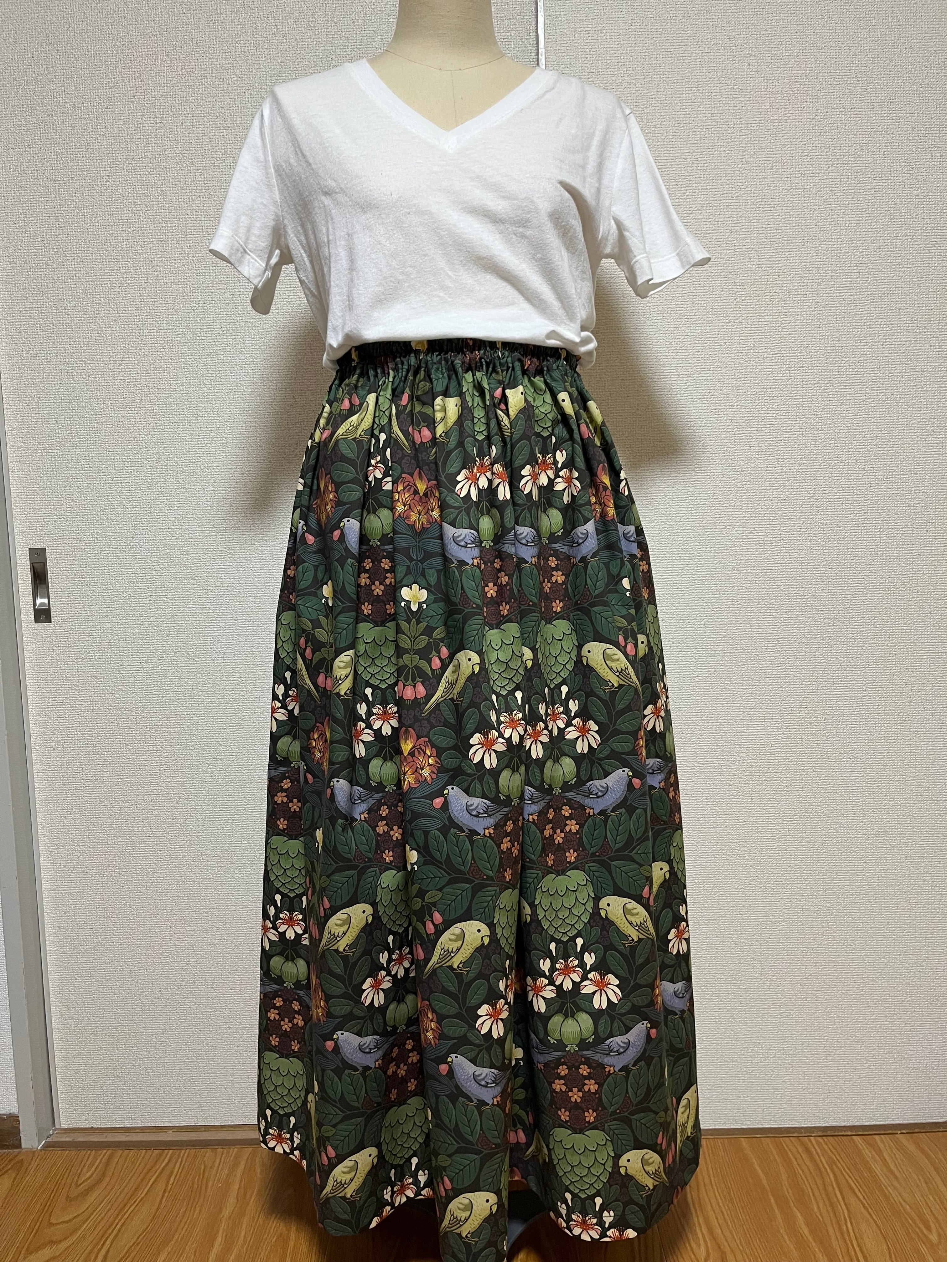 フリーサイズのギャザースカートになります。ウエストのゴムは柔らかい物を使用しているのでら締め付け感無く着用いただけます。