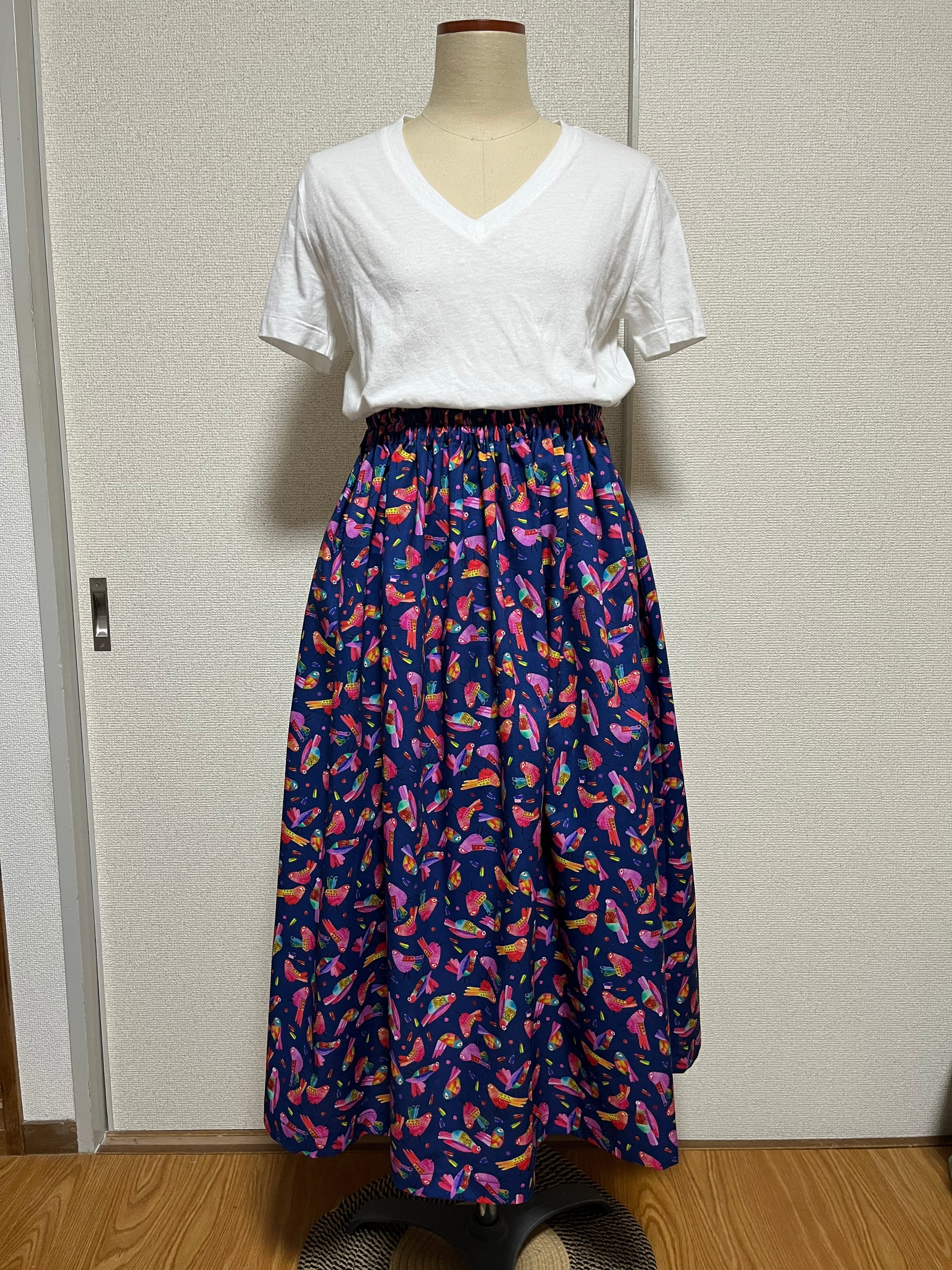 輸入生地を使って製作したギャザースカートです。ウエストのゴムは柔らかい物を使用しているのでら締め付け感無く着用いただけます。
